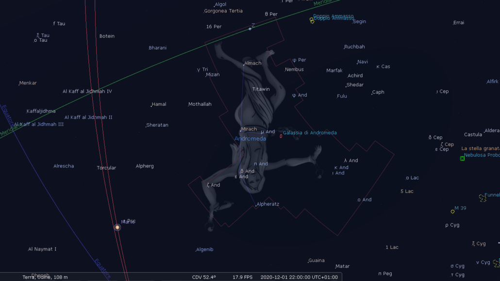 Andromeda dà il meglio di sè, alta sull’orizzonte celeste, proprio durante l’autunno. La troviamo ad ovest in queste sere di fine stagione e c’è un elemento in particolare che potrebbe attirare la nostra attenzione. Facendoci aiutare magari da un binocolo possiamo scorgere una piccola macchia biancastra che corrisponde alla Galassia di Andromeda. Questo conglomerato composto da miliardi di stelle e polveri cosmiche è l’oggetto stellare più lontano visibile anche ad occhio nudo, nei cieli tersi e liberi da inquinamento luminoso. Questa galassia ha, come la Via Lattea, una forma a spirale ma è molto più grande di quest’ultima (una volta e mezza) e pure tre volte più luminosa. C’è però un legame ulteriore tra la nostra galassia e quella di Andromeda, cioè lo spostamento lento (in termini astronomici) ma inesorabile di una verso l’altra; ciò porterà questi due oggetti, fra qualche miliardo di anni, a collidere.